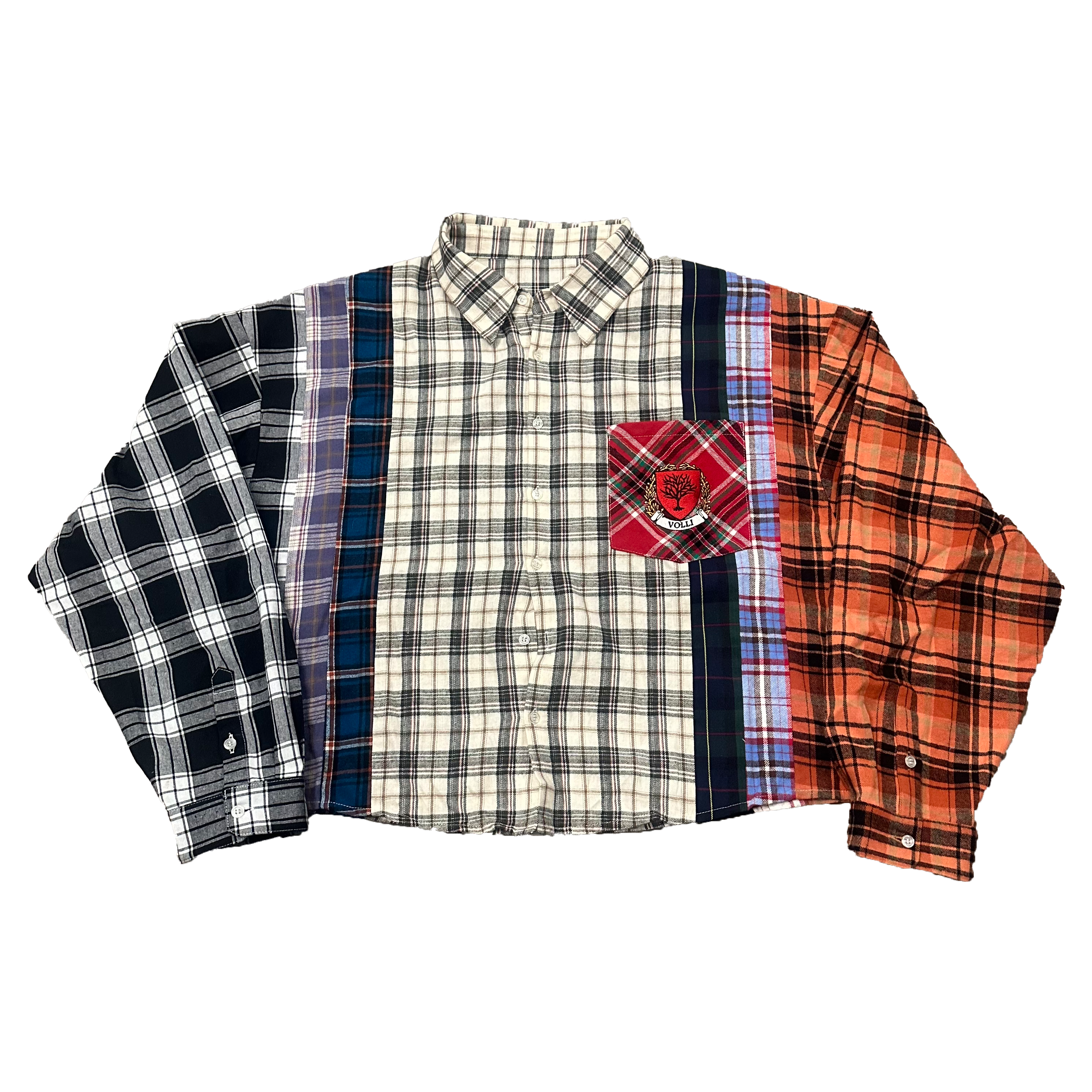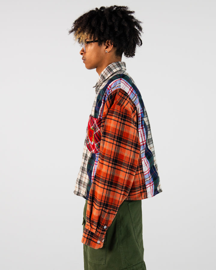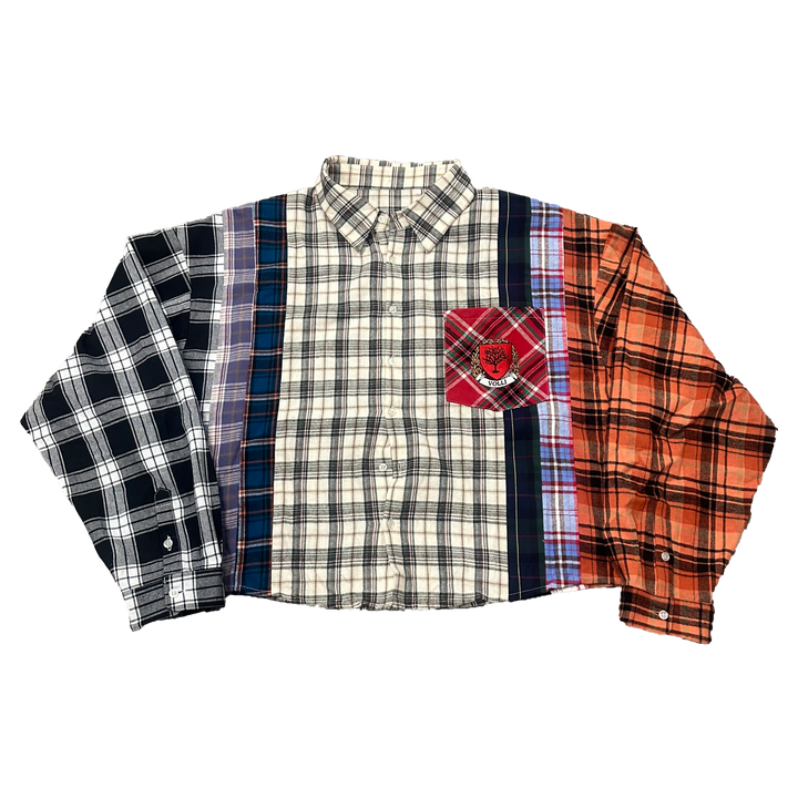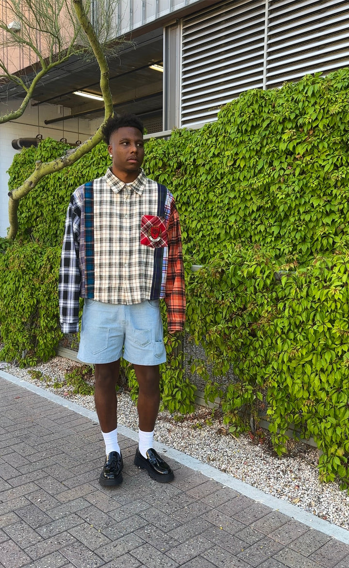 Elevate your style with our distinctive cropped flannel shirt, designed for a bold and modern look. This piece features a unique mix of flannel fabrics and meticulous detailing, making it a standout addition to your wardrobe.