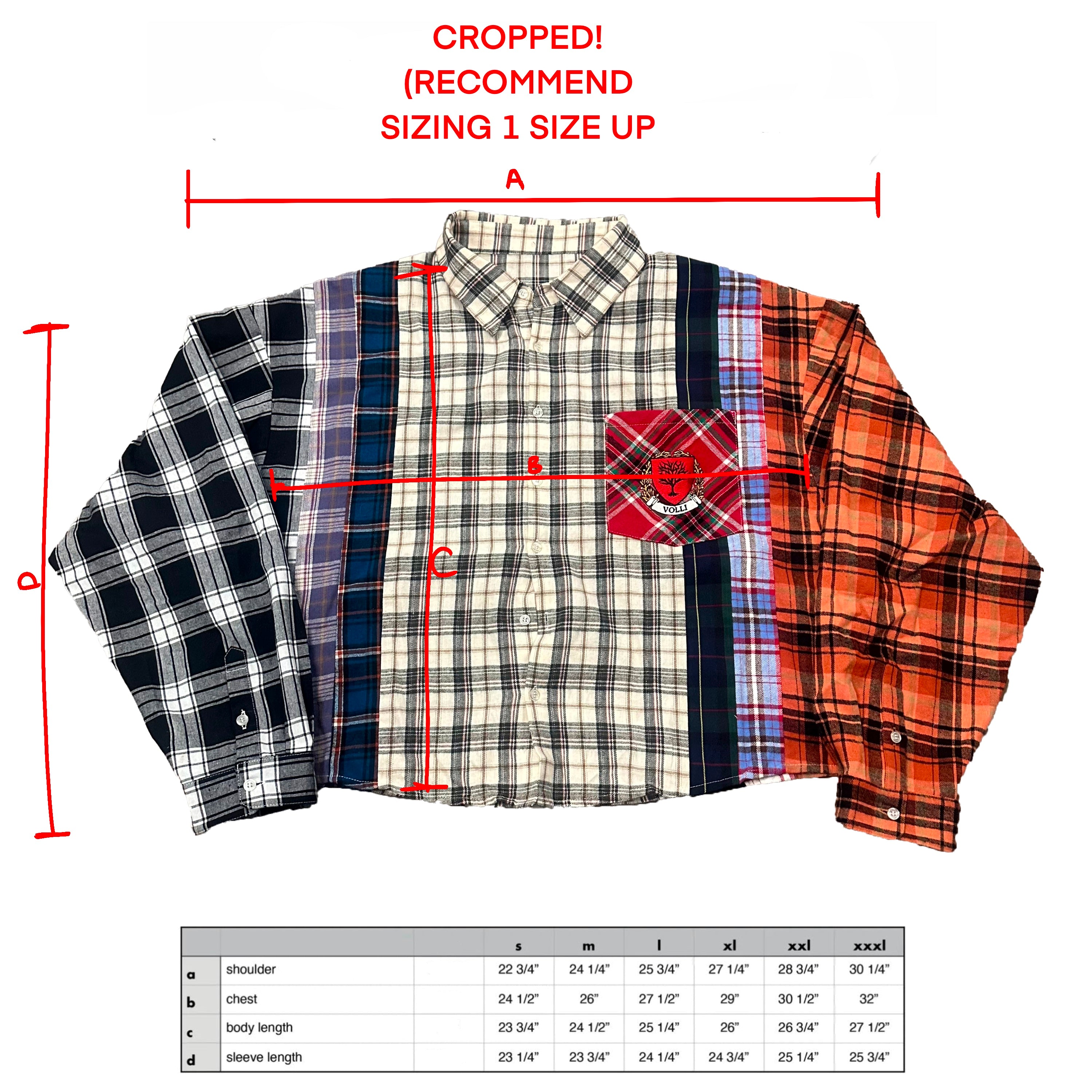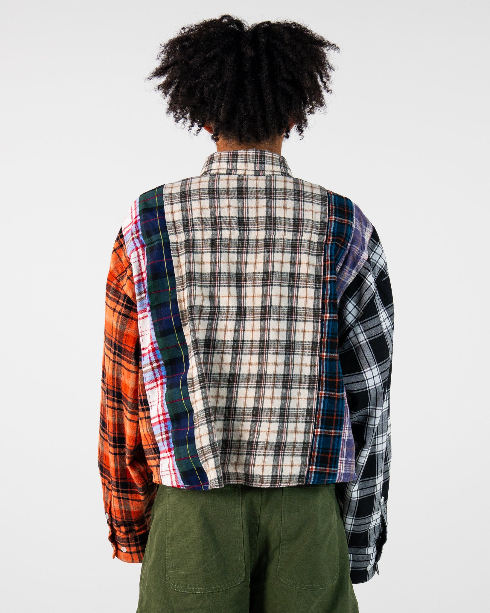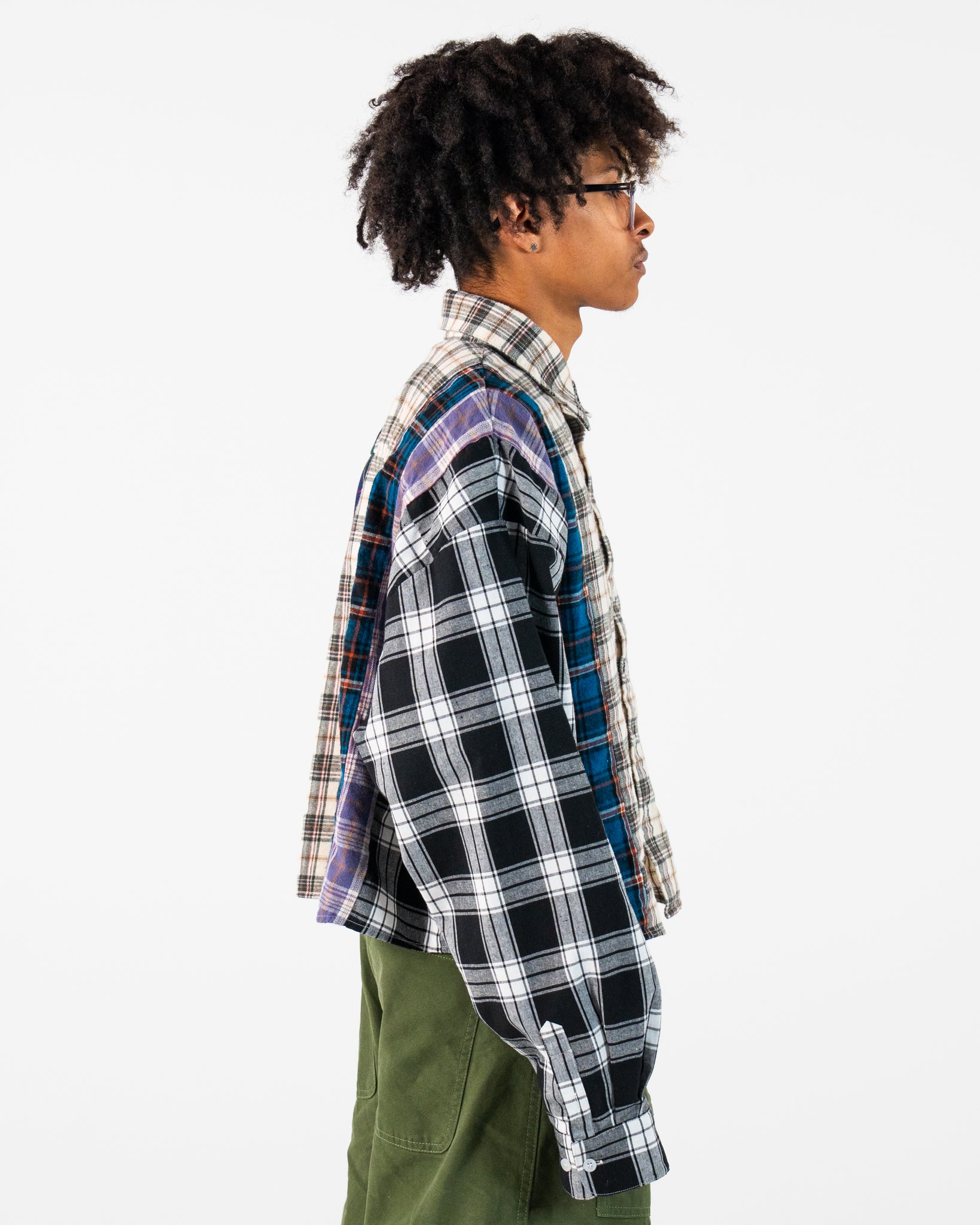 Elevate your style with our distinctive cropped flannel shirt, designed for a bold and modern look. This piece features a unique mix of flannel fabrics and meticulous detailing, making it a standout addition to your wardrobe.